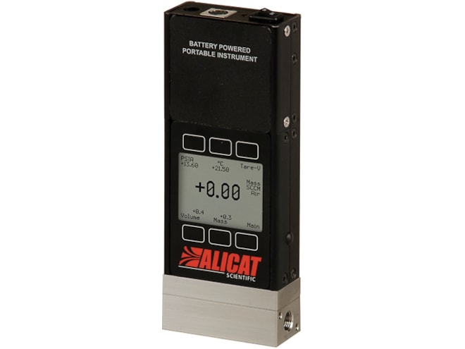 The Alicat Scientific MB Series portable mass flow meter is a rechargeable battery-powered instrument, perfect for verifying flow rates in places that are off the beaten path. With 18 hours of continuous operation on a single charge and +/-0.8% of reading accuracy, these handheld meters bring laboratory-class accuracy to field flow verification and validation applications in the environmental, manufacturing and metrology industries.